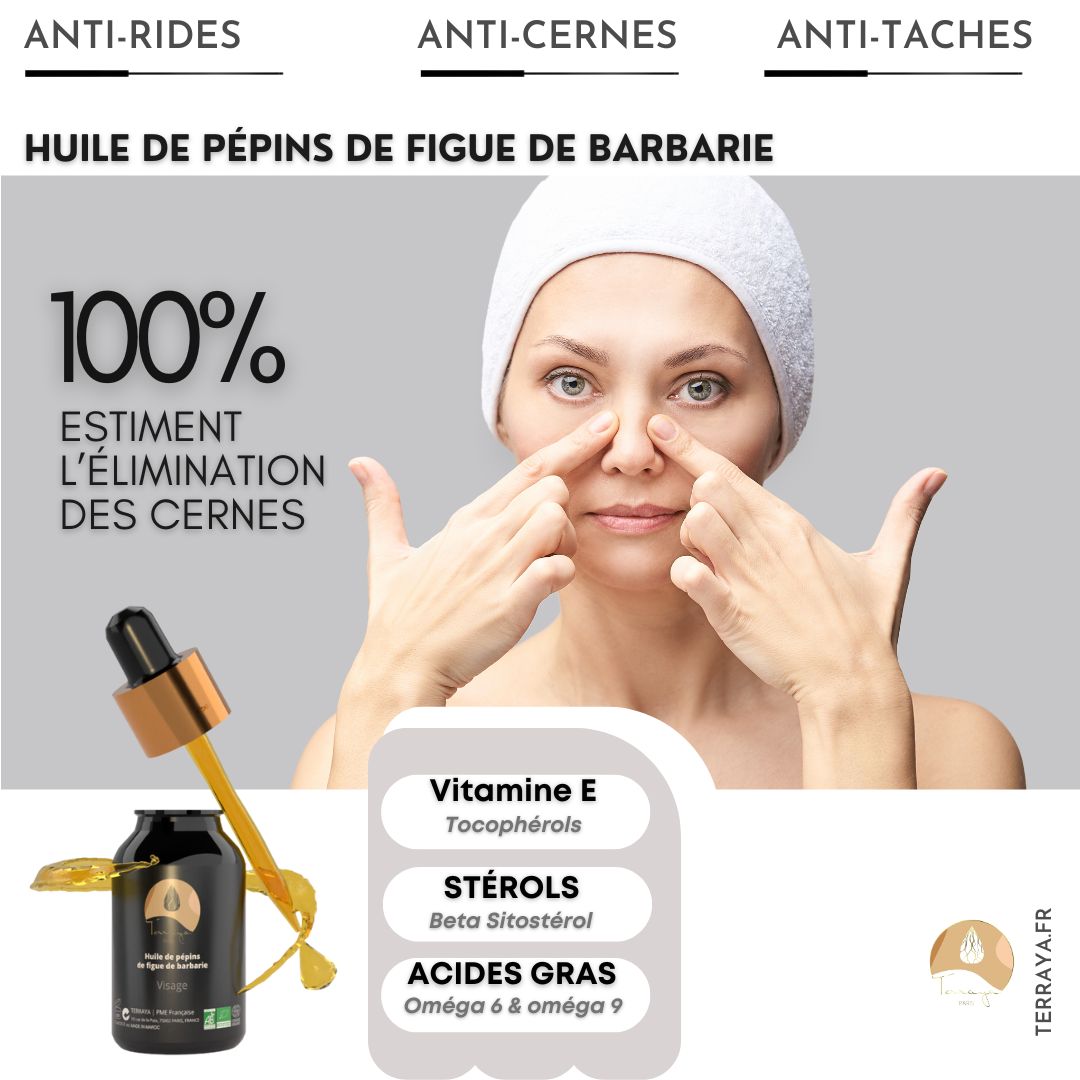 Efficacité de l'huile de pépins de figue de barbarie : Une huile légère et non grasse, riche en vitamine E et en acides gras essentiels, parfaite pour nourrir, hydrater et apaiser les peaux délicates. Elle aide à atténuer les cernes, les rides et les signes de fatigue, tout en restaurant l'éclat naturel de la peau.
