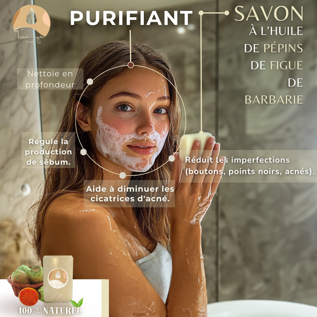 Le savon huile de pépins de figue de barbarie de chez Terraya Paris, nettoie en profondeur sans agresser la peau, éliminant l'excès de sébum et les impuretés responsables des boutons, mais aussi raffermit la peau. Son action douce convient à tous types de peau, même les plus sensibles. Il laisse la peau propre, fraîche et apaisée après chaque utilisation.